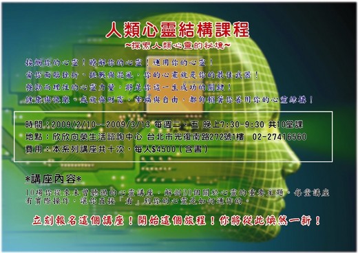 時間:2009/2/10---2009/3/13每週二、五晚上7:30-9:30 共10堂課